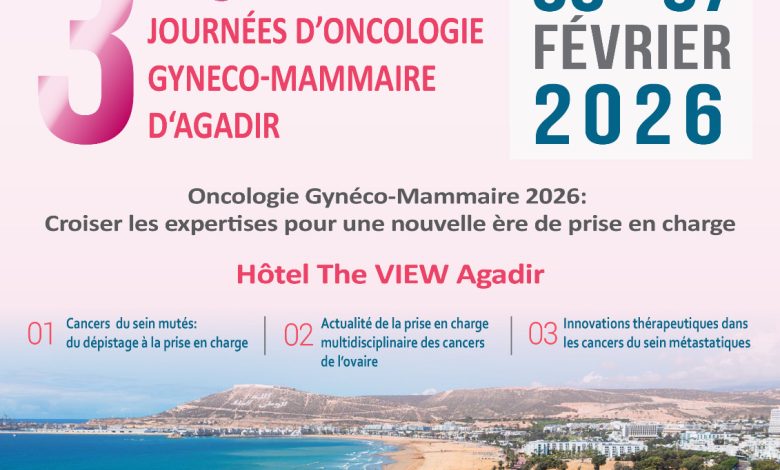 بتنسيق مع مصلحة الأنكولوجيا الطبية بالمركز الاستشفائي الجامعي محمد السادس بأكادير، تنظم “جمعية أخصائيي الأورام الطبية بأكادير”، الدورة الثالثة لأيام أكادير للأنكولوجيا النسائية الثديية،يومي 6 و7 فبراير 2026. (3è journées d’oncologie gynéco-mammaire d’Agadir) تحت شعار تجميع الخبرات من أجل عهد جديد في التكفّل بالعلاج“بمشاركة نخبة من الأخصائيين والخبراء في مجال الأنكولوجيا.