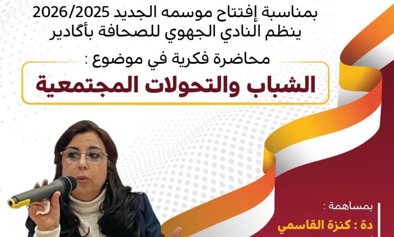 في إطار افتتاح موسمه الإعلامي والثقافي الجديد 2025-2026، يستعد النادي الجهوي للصحافة سوس ماسة بأكادير لتنظيم محاضرة فكرية مميزة حول موضوع: “الشباب والتحولات المجتمعية”، وذلك يوم السبت 18 أكتوبر 2025 على الساعة الرابعة مساءً، بغرفة التجارة والصناعة والخدمات بأكادير.