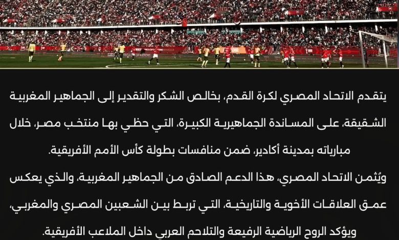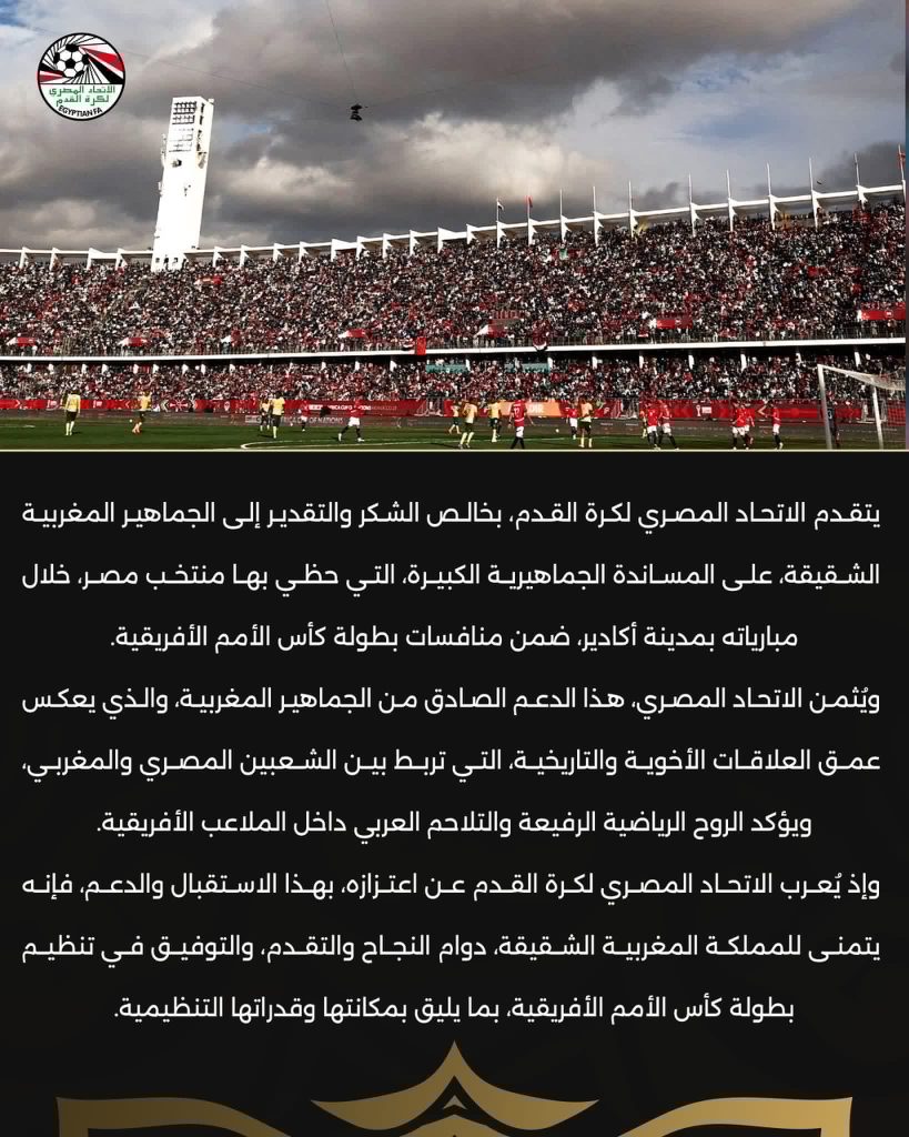 عبّر الاتحاد المصري لكرة القدم عن خالص شكره وامتنانه للجمهور المغربي، على الدعم الكبير الذي قدمه للمنتخب المصري خلال مباراته أمام منتخب جنوب أفريقيا، والتي احتضنها الملعب الكبير بأكادير، في أجواء جماهيرية مميزة.