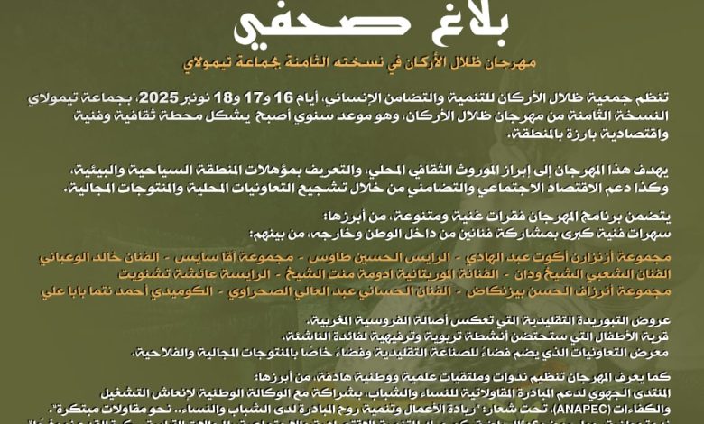 تنظم جمعية ظلال الأركان للتنمية والتضامن الإنساني، أيام 16 و17 و18 نونبر 2025 بجماعة تيمولاي، الدورة الثامنة لمهرجان ظلال الأركان، وهو موعد ثقافي وفني واقتصادي يحتفي بالتراث المحلي ويعزز دور التعاونيات والمنتوجات المجالية.