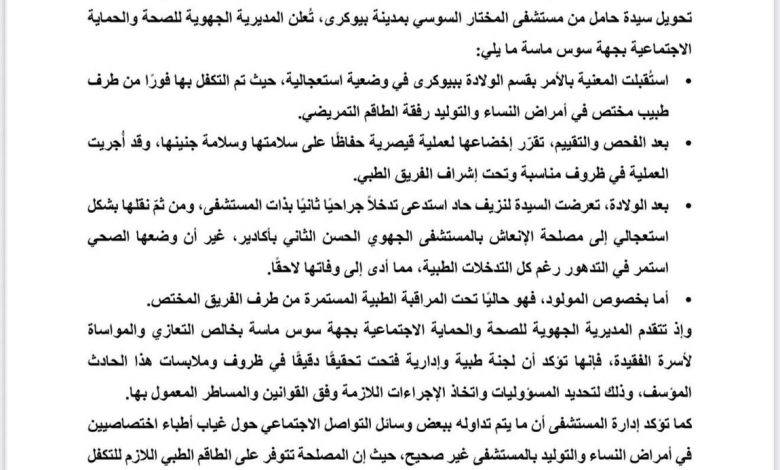 أصدرت المديرية الجهوية للصحة والحماية الاجتماعية بجهة سوس ماسة، اليوم الأربعاء، بلاغًا توضيحيًا حول حالة الوفاة التي سُجلت صباح يوم الثلاثاء 7 أكتوبر 2025 بمستشفى الحسن الثاني بأكادير، عقب تحويل سيدة حامل من مستشفى المختار السوسي بمدينة بيوكرى.
