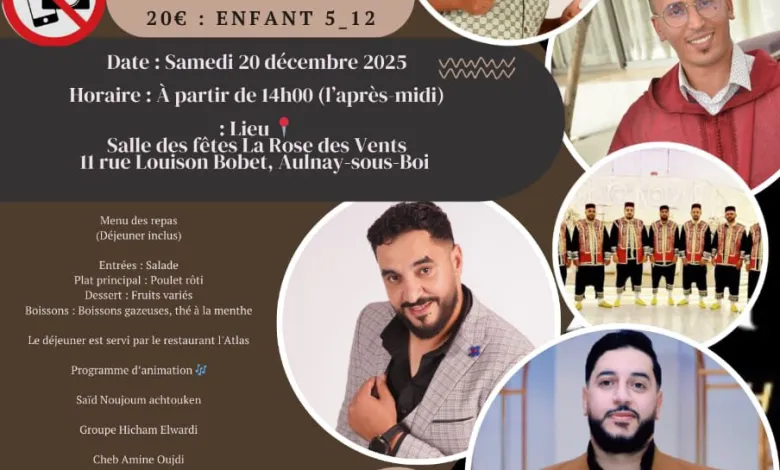 تستعد مجموعة **”فاعل خير”** لتنظيم أمسية مغربية أصيلة تجمع بين النكهة الفنية والتراث العائلي، وذلك يوم **السبت 20 دجنبر 2025** بقاعة الاحتفالات *La Rose des Vents* بمدينة **أوني سو بوا** الفرنسية. الحدث، الذي يُرتقب أن يشهد حضوراً مهماً للجالية المغربية، يُقدم نموذجاً للقاءات العائلية التي تمزج بين المتعة الفنية والأجواء التراثية المتميزة.