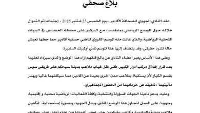 عقد النادي الجهوي للصحافة بأكادير، يوم الخميس 25 شتنبر 2025، اجتماعاً خُصص لتدارس الوضع الرياضي بالمنطقة، مع التركيز على معضلة…