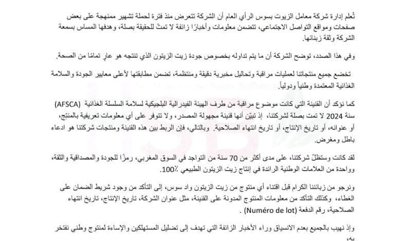 وفي هذا السياق، نوّهت الشركة إلى أن موضوعاً جرى تداوله مؤخراً بخصوص تقرير صادر عن الهيئة الفيدرالية لسلامة السلسلة الغذائية البلجيكية (AFSCA)، يتعلق بمراقبة منتجات سنة 2024، وأنه لا يمتّ بصلة إلى منتجات الشركة، مشيرة إلى أن التقرير لم يتضمن أي إشارة تقنية تخص زيت المصبّرة أو أي معلومات تعريفية عن المنتجات أو عناوينها أو تاريخ إنتاجها.