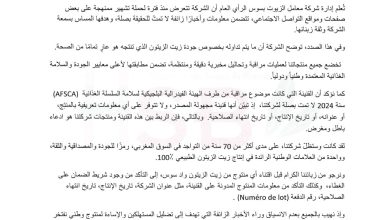 أصدرت شركة معامل الزيوت سوس بلحسن (HSB) بلاغاً توضيحياً للرأي العام، أكدت فيه أنها تتعرض منذ فترة لحملة مغرضة على…